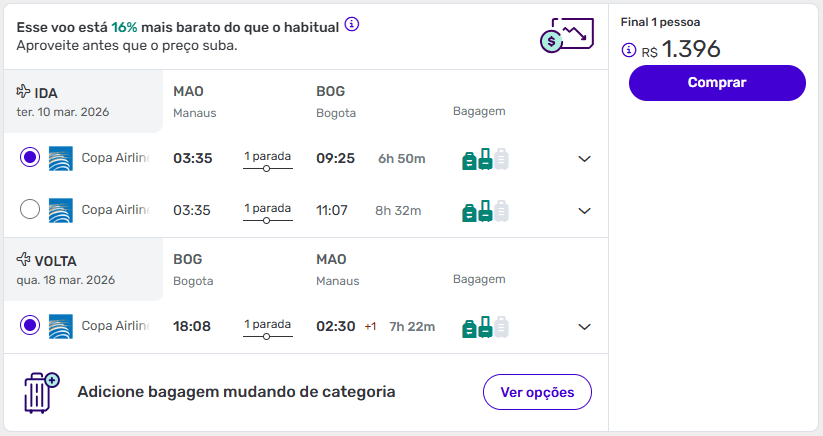 As passagens aéreas mais baratas que encontramos são de voos que partem de Manaus, Belo Horizonte, Belém, Brasília e outras cidades brasileiras, com opções de embarque em março de 2026.