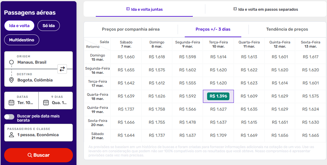 Faça sua busca e clique em “Preços +/- 3 dias” que um calendário com combinações de datas com as melhores ofertas irá se abrir.