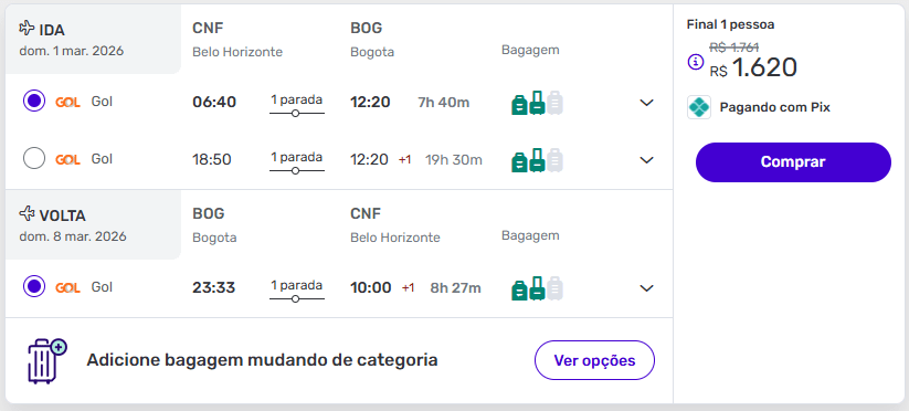 Passagens de ida e volta de Belo Horizonte para Bogotá a partir de R$ 1.620