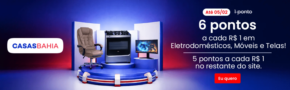 Casas Bahia: 6 pontos a cada R$ 1,00 em Eletrodomésticos, Móveis e Telas e 5 pontos a cada R$ 1,00 no restante do site.