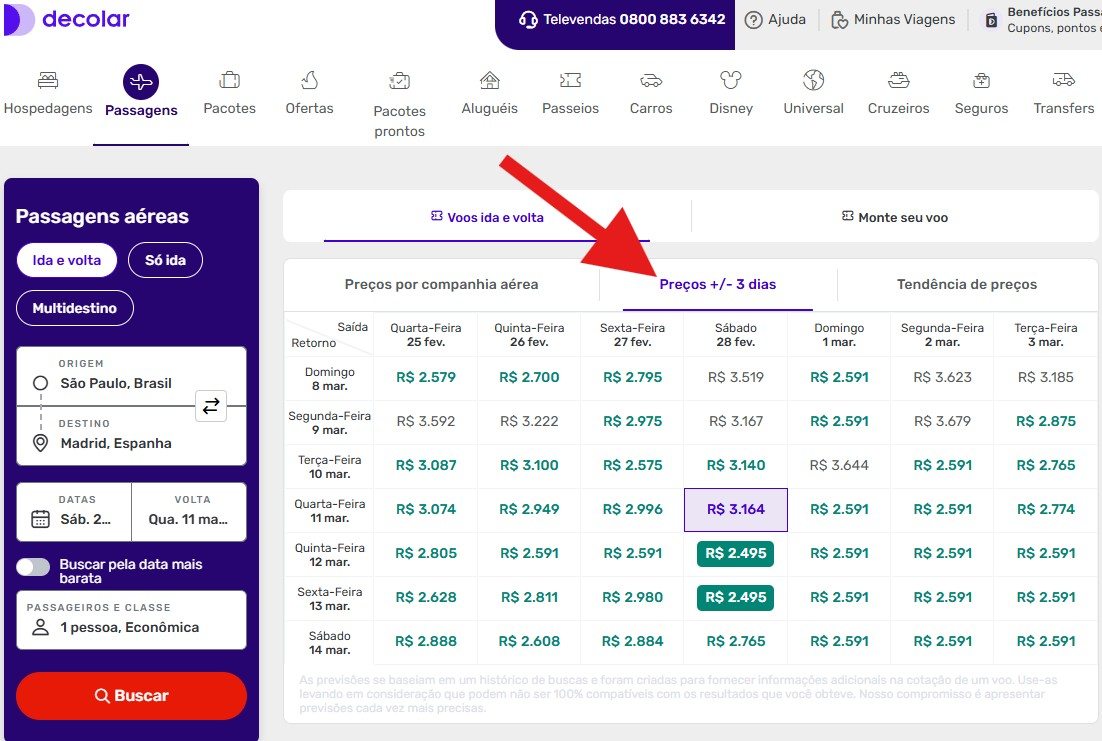 Para localizar as menores tarifas CLIQUE AQUI e você será direcionado a uma oferta no site da Decolar para viajar em março de 2026, no site da Decolar, clique em “Preços +/- 3 dias” para abrir um calendário (veja na imagem abaixo) com diversas combinações de datas com preços baixos!