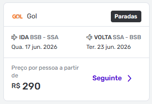 Na imagem: de Brasília (BSB) para Salvador (SSA) a partir de R$ 290 ida e volta, com taxas.