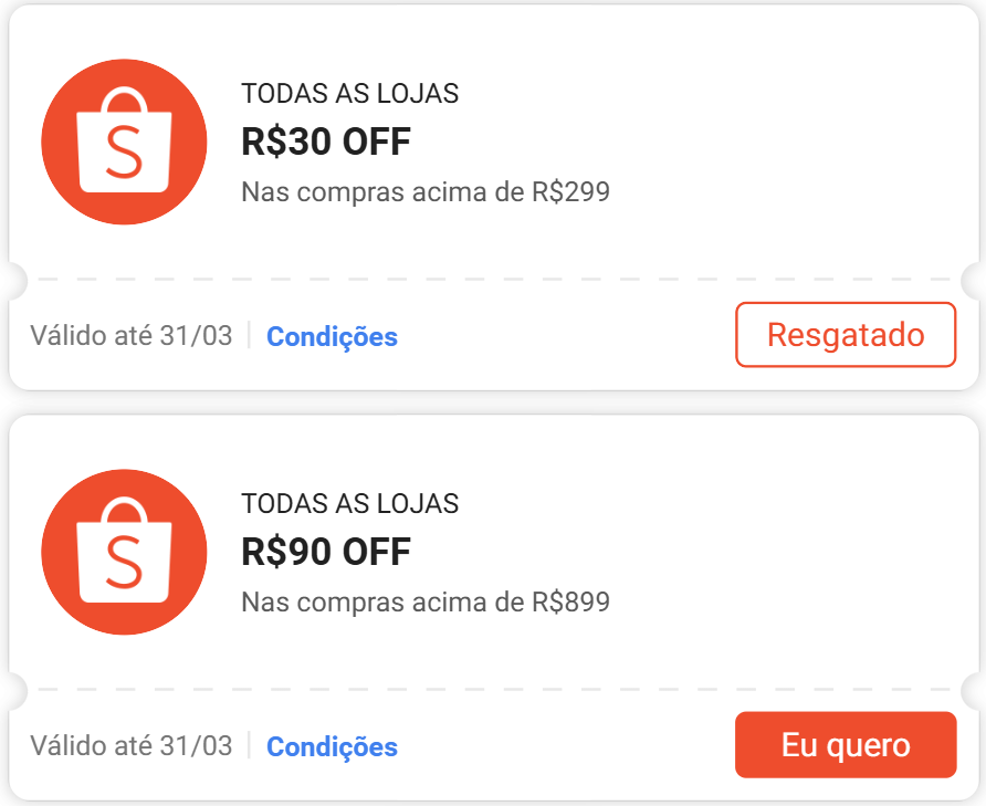 A Shopee liberou nesta terça-feira (31) os seguintes cupons: