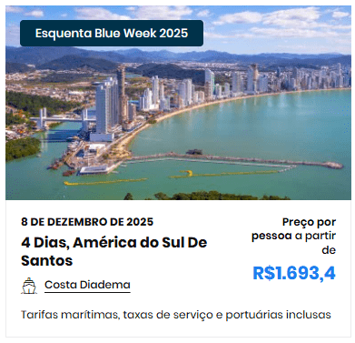 Durante a pesquisa, encontramos cruzeiros de 4 dias a partir de R$ 1.637,80 por pessoa em cabine interna dupla, com alimentação inclusa, saindo de Santos – SP.