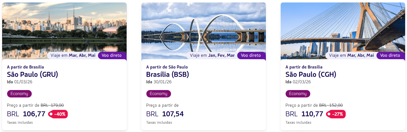 - Brasília → São Paulo (VCP): a partir de R$ 135,77
