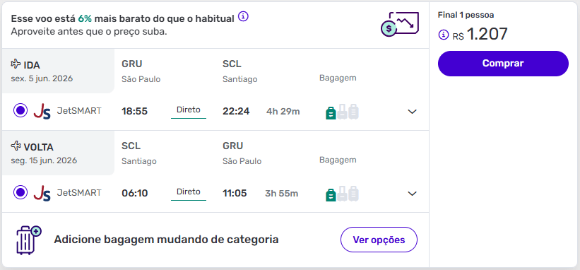 Exemplos de passagens aéreas para Santiago abaixo do padrão de preços