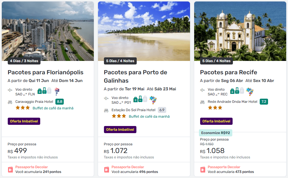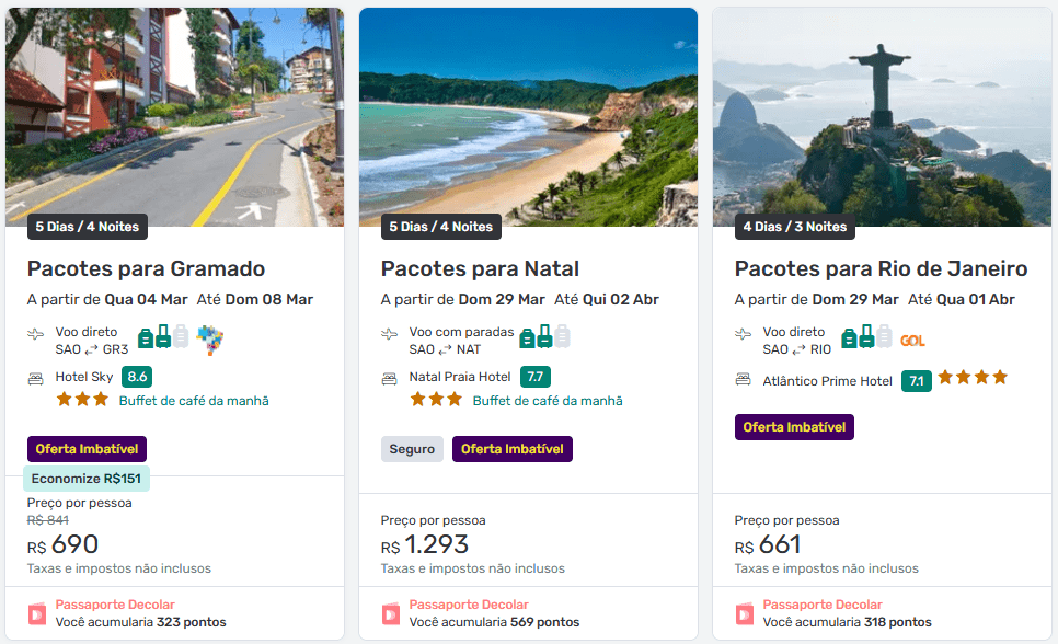 Exemplos de pacotes nacionais que aparecem nas buscas
