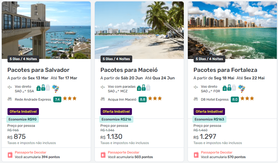 As buscas também mostram pacotes para capitais do Nordeste, incluindo datas em diferentes períodos do ano, o que influencia diretamente nos preços finais.