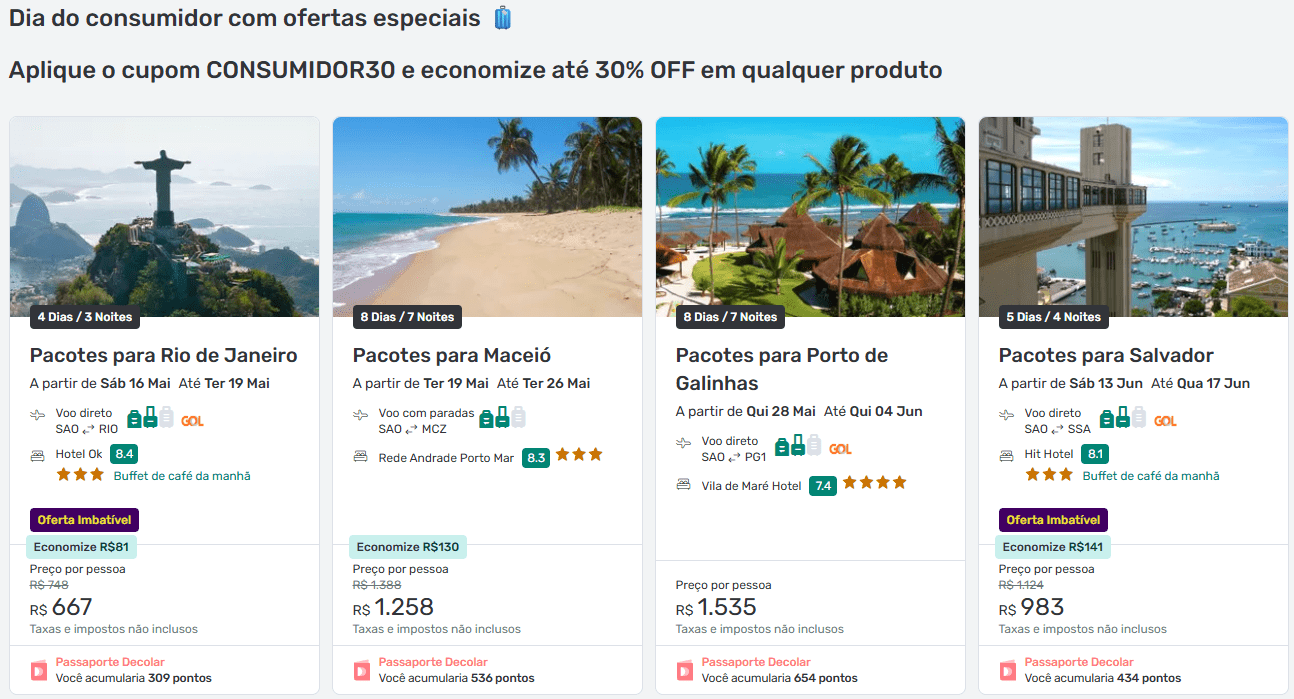 A agência de viagens Decolar liberou um cupom de até 30% de desconto durante a Semana do Consumidor. Em buscas realizadas neste domingo (15), é possível encontrar pacotes completos com voos e hospedagem a partir de R$ 579 por pessoa, com taxas e impostos adicionados apenas na etapa final da compra.