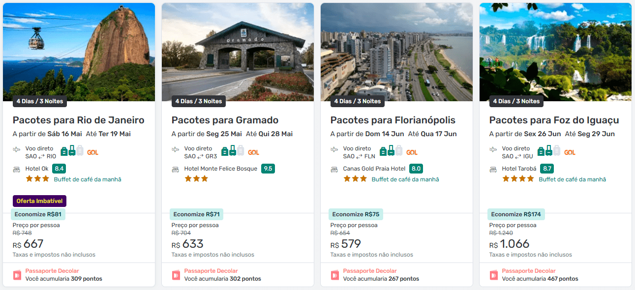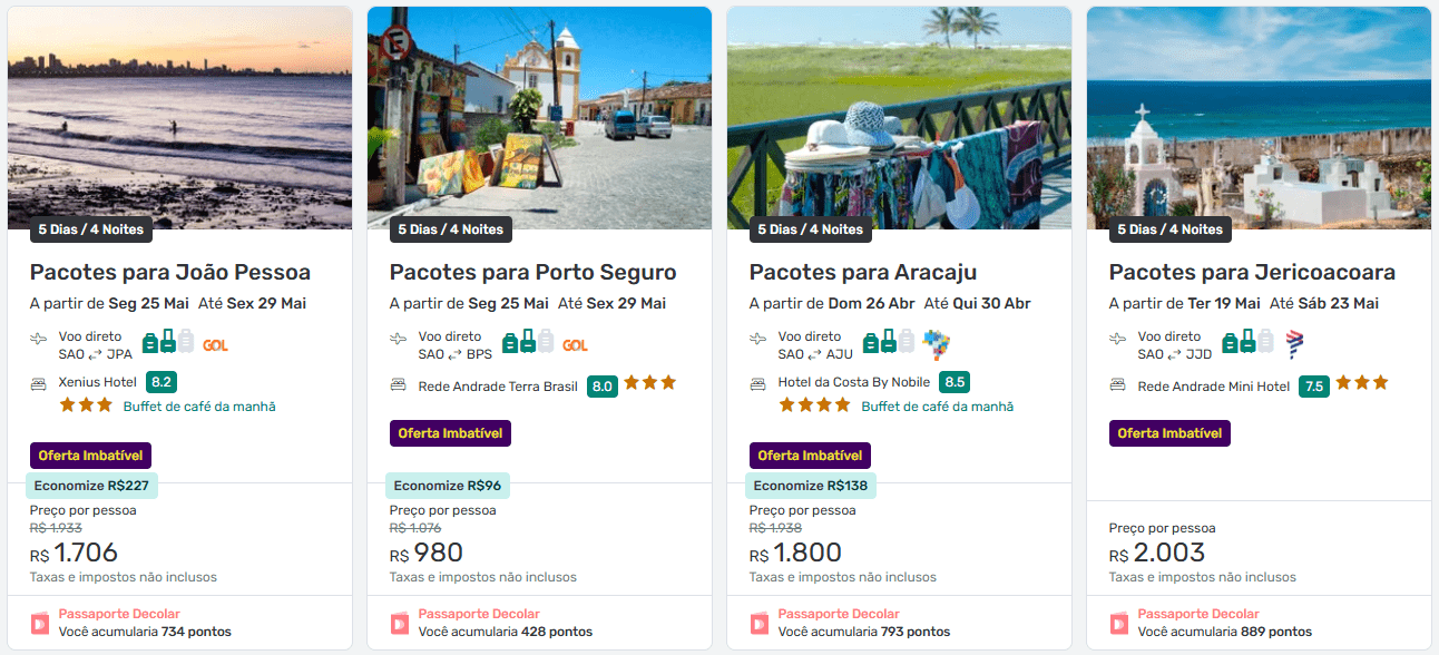 As ofertas aparecem para diversos destinos brasileiros e incluem viagens com duração entre 4 e 8 dias. Como os preços são dinâmicos e mudam conforme disponibilidade de voos e hotéis, algumas oportunidades podem se esgotar rapidamente.