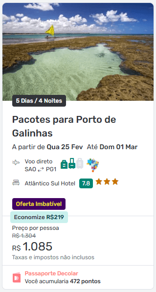 As passagens aéreas partem de São Paulo (a cidade de origem do voo também pode ser alterada, o que influencia no preço) com destino a Recife, a principal porte de entrada de Porto de Galinhas. Recife fica a cerca de 63 km de Porto de Galinhas e você pode contratar o transfer também no site da Decolar.