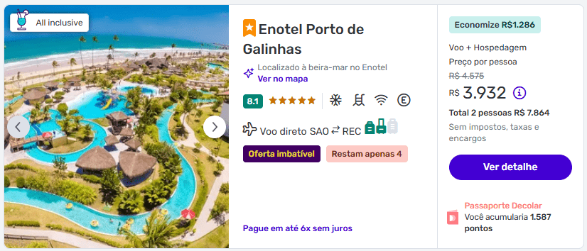 O hotel em questão é o Atlântico Sul Hotel com nota 7.8, e claro, fica em Porto de Galinhas.