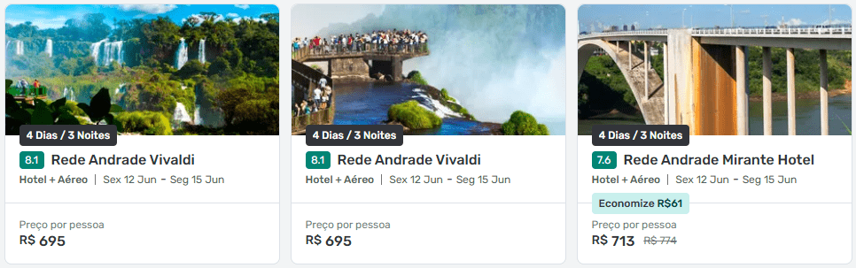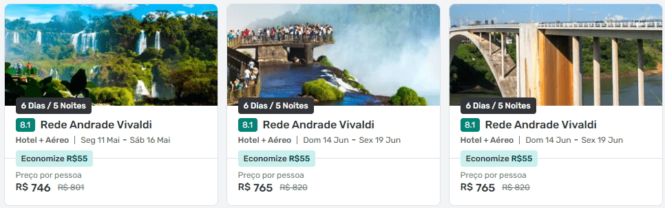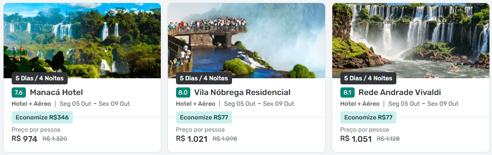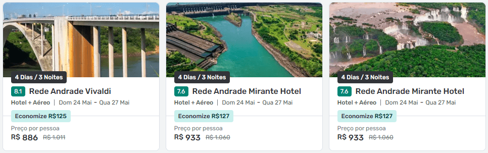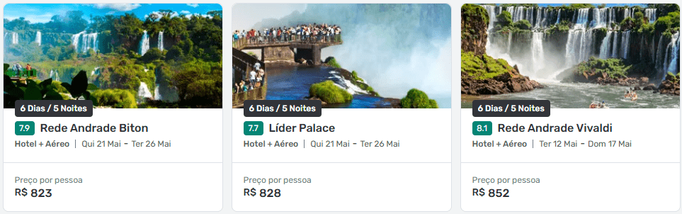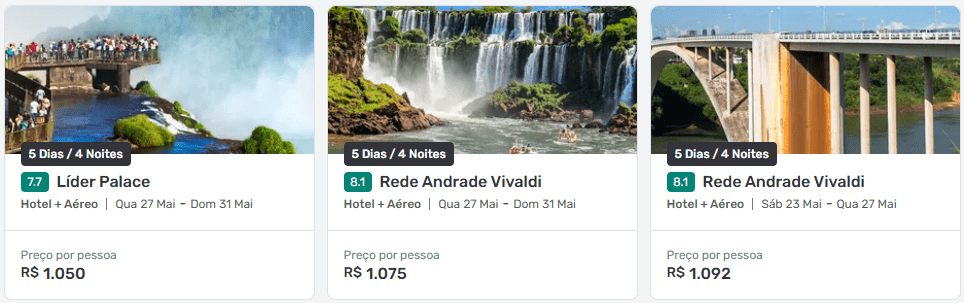 Localizamos nesta quinta-feira (19) pacotes em promoção para Foz do Iguaçu com passagens aéreas de ida e volta + hospedagem saindo de diversas cidades brasileiras.