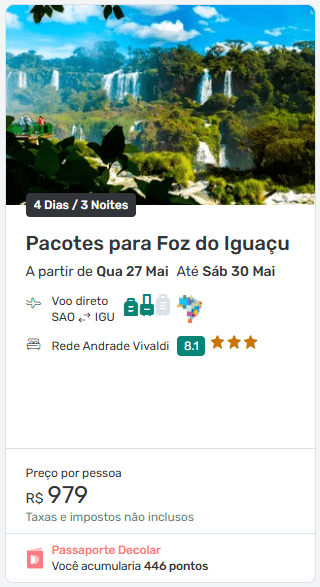 A agência de viagens Decolar está oferecendo pacotes promocionais para Foz do Iguaçu, no Paraná, durante a Semana do Consumidor. Em buscas realizadas nesta sexta-feira (13), é possível encontrar opções com voos e hospedagem na cidade por valores a partir de R$ 979 por pessoa, com taxas e impostos adicionados apenas na etapa final da compra.