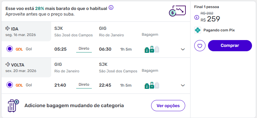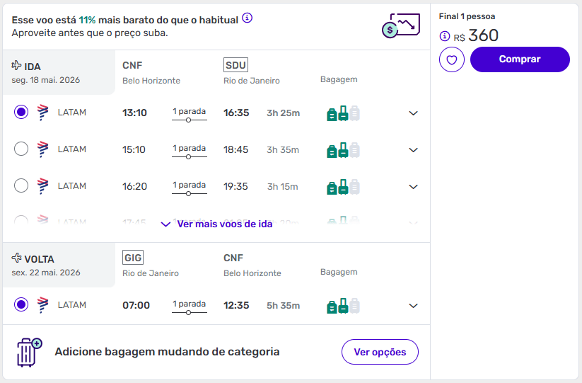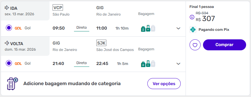 As ofertas mais em conta partem de São Paulo, Vitória, São José dos Campos ou Belo Horizonte, mas existem excelentes tarifas também saindo de outras cidades, com datas disponíveis para quem quer viajar até maio de 2026.