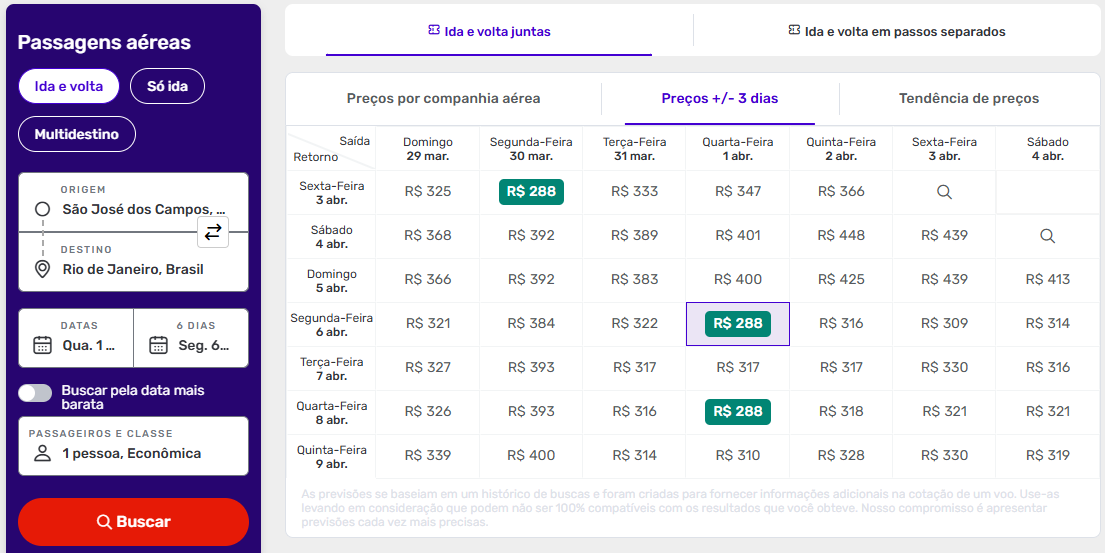 Faça sua busca e depois clique em “Preços +/- 3 dias” que um calendário com combinações de datas com as melhores ofertas irá se abrir.