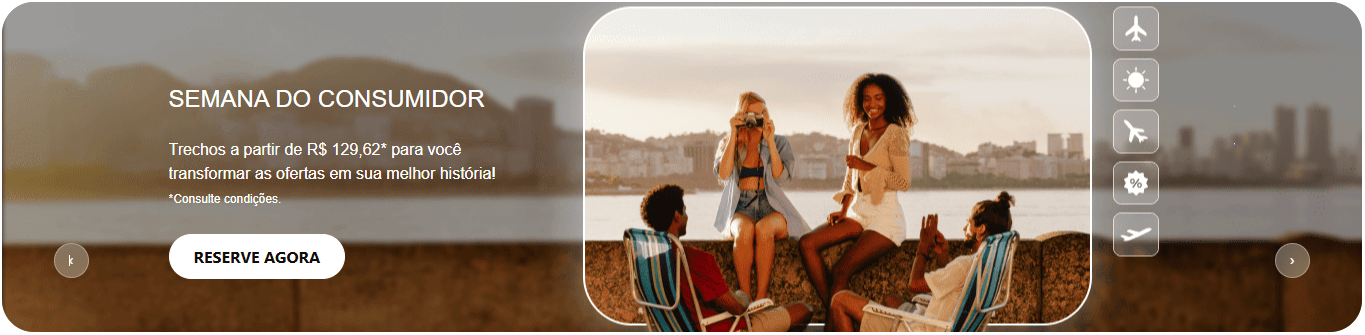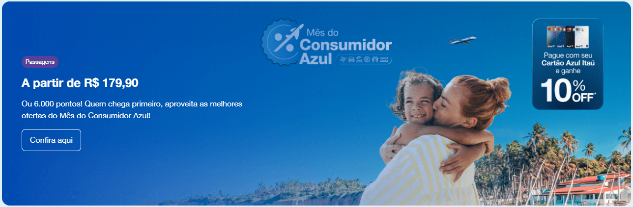 A Azul também já está promovendo ofertas relacionadas ao período do consumidor. A companhia divulgou campanhas do Mês do Consumidor, com passagens anunciadas a partir de R$ 179,90 ou resgates a partir de 6.000 pontos.