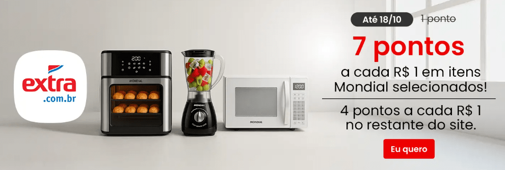 Extra: 7 pontos a cada R$ 1,00 em itens Mondial selecionados e 4 pontos a cada R$ 1,00 no restante do site.