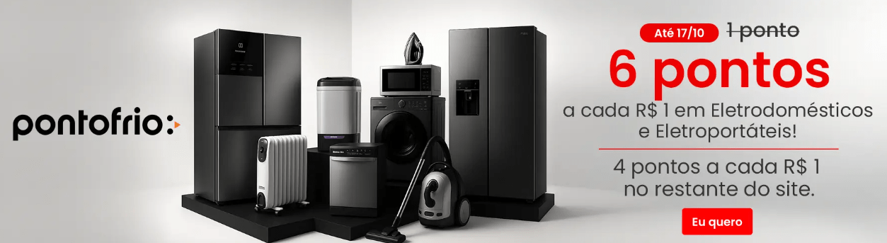 Ponto Frio: 6 pontos a cada R$ 1,00 em eletrodomésticos e eletroportáteis e 4 pontos a cada R$ 1,00 no restante do site.