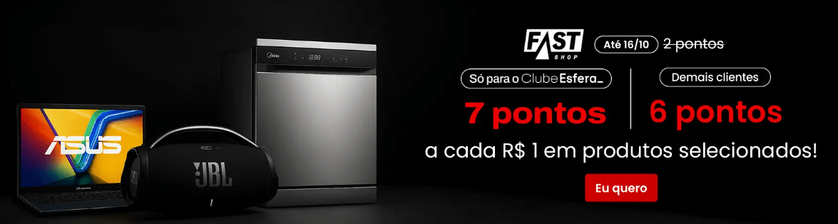 FastShop: 7 pontos a cada R$ 1,00 para clientes Clube Esfera e 6 pontos a cada R$ 1,00 para demais clientes – apenas produtos selecionados.
