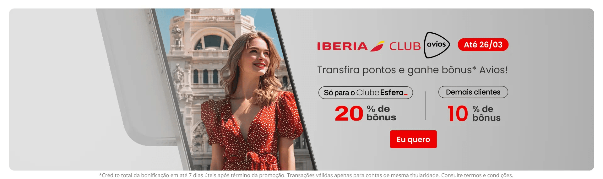 Ao transferir pontos Esfera dentro do período da campanha, você recebe milhas no Iberia Club com um bônus adicional: