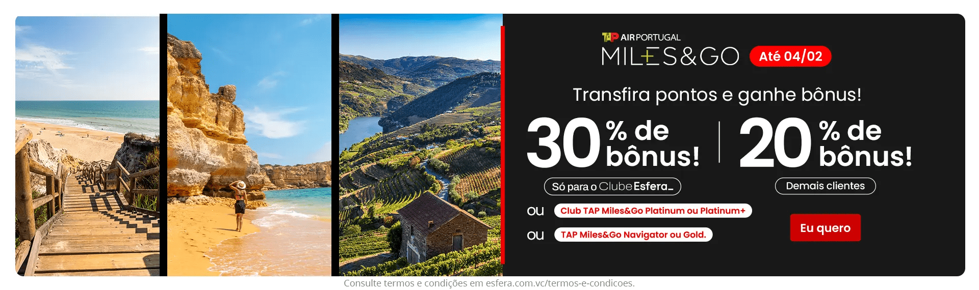 A Esfera está com uma campanha de transferência bonificada para o TAP Miles&Go, programa de fidelidade da TAP Air Portugal, oferecendo bônus de até 30% em milhas. A promoção é válida entre 2 e 4 de fevereiro de 2026, ou até o limite de estoque de milhas disponibilizado para a ação.
