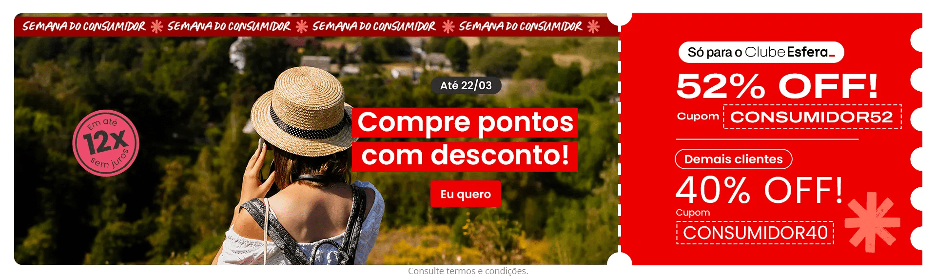 A Esfera reforçou as ofertas da Semana do Consumidor com uma campanha de compra de pontos que combina desconto elevado e condições facilitadas de pagamento. A promoção é válida até 22 de março.