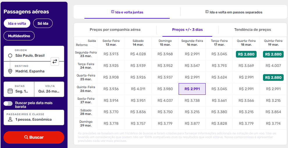 Faça sua busca e clique em “Preços +/- 3 dias” que um calendário com combinações de datas com as melhores ofertas irá se abrir.
