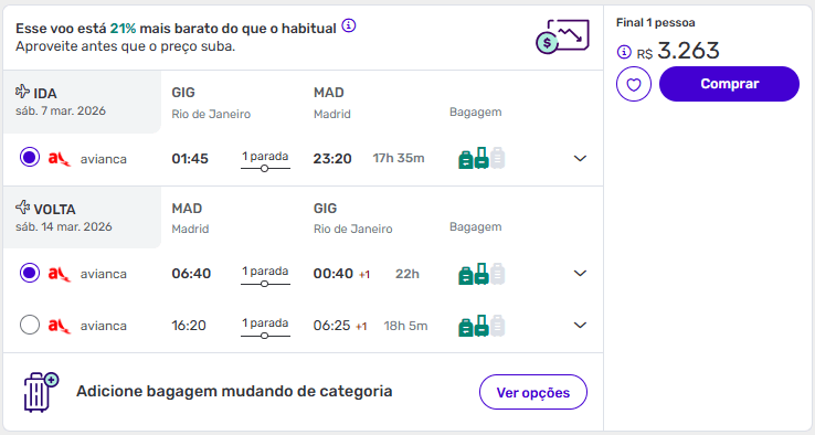 Passagens de ida e volta de São Paulo para Madrid a partir de R$ 2.991 Datas: 18 a 25 de março de 2026.