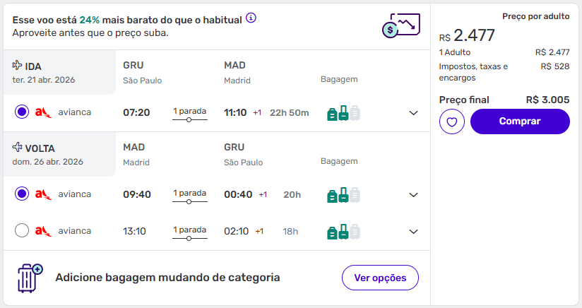 Encontramos nesta sexta (2/1), ofertas de voos de ida e volta para Madrid ou Barcelona, a partir de R$ 3.005, com taxas inclusas.