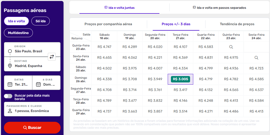Faça sua busca e clique em “Preços +/- 3 dias” que um calendário com combinações de datas com as melhores ofertas irá se abrir.