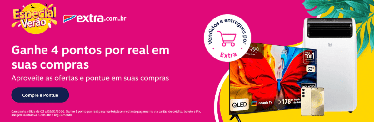 Extra: 4 pontos por real gasto em produtos vendidos e entregues por Extra e 1 ponto por real para marketplace mediante pagamento via cartão de crédito, boleto e Pix.