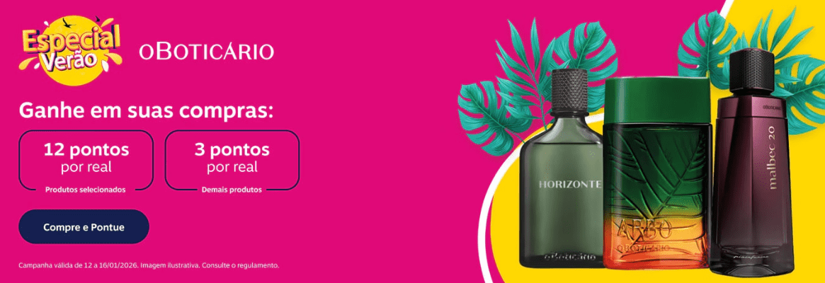 O Boticário: 12 pontos por real gasto em produtos selecionados e 3 pontos por real para demais produtos.