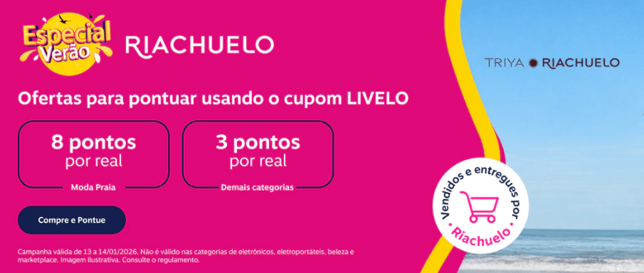 Riachuelo: 8 pontos por real gasto na categoria Moda Praia e 3 pontos demais categorias. Válido para produtos vendidos e entregues por Riachuelo.