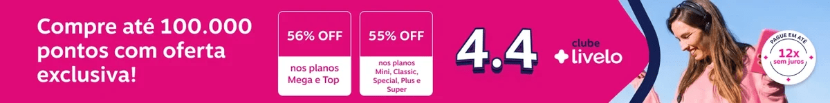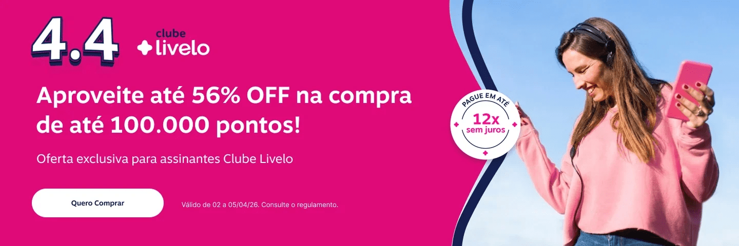 Com até 56% de desconto, a campanha da Livelo entra no radar — especialmente para quem já está se preparando para o 4.4 e quer montar saldo antecipadamente.
