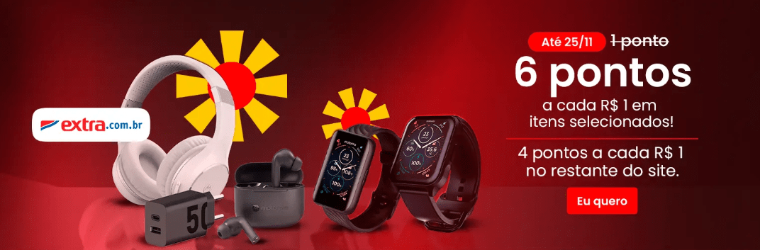 Extra: 6 pontos a cada R$ 1,00 em produtos selecionados e 4 pontos a cada R$ 1,00 no restante do site.