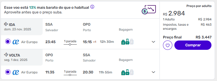 Passagens de Salvador para Porto (Portugal) a partir de R$ 3.447 ida e volta