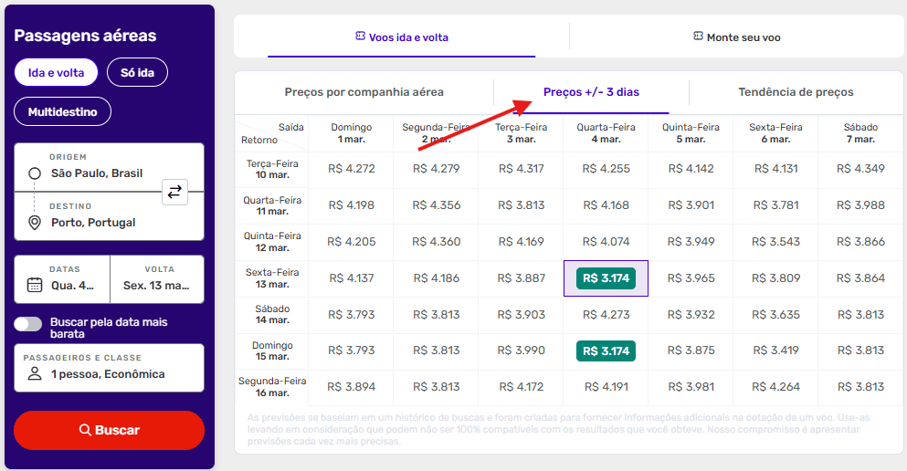 Faça sua busca e clique em “Preços +/- 3 dias” que um calendário com combinações de datas com as melhores ofertas irá se abrir.