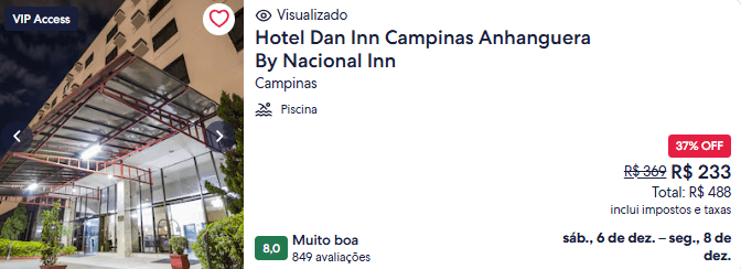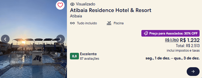 Entre as ofertas verificadas, há 37% de desconto no Hotel Dan Inn Campinas Anhanguera By Nacional Inn; 34% no Hotel Pousada Palos Verdes, em São José dos Campos, 30% no Atibaia Residence Hotel & Resort, e 27% off no The Green Ecologic Hotel, no Guarujá.