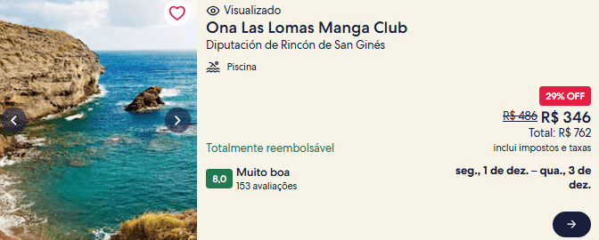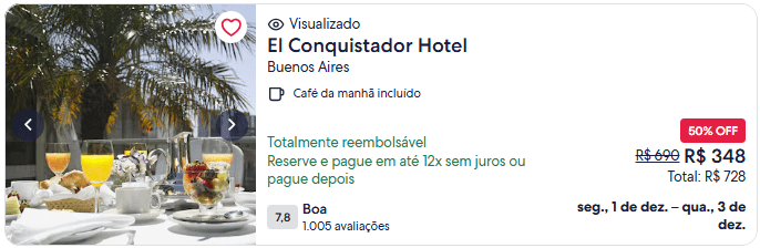 Quem pretende viajar para fora do país também encontra oportunidades expressivas. O El Conquistador Hotel, em Buenos Aires, está com 50% de desconto e o Ona Las Lomas Manga Club, 4 estrelas em Cartagena, com 29%.