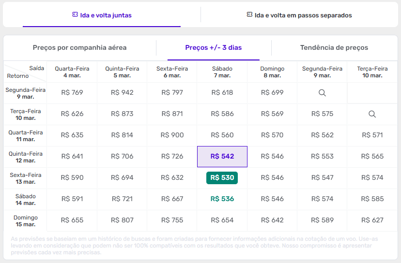 Faça sua busca e clique em “Preços +/- 3 dias” que um calendário com combinações de datas com as melhores ofertas irá se abrir.