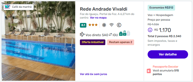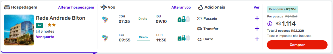 A promoção inclui voos diretos para Foz do Iguaçu com hospedagem em ótimas opções te hotéis como o Rede Andrade Biton, localizado a 10 minutos de carro de Ponte da Amizade, por preços a partir de R$ 1.114 por pessoa (3 noites).