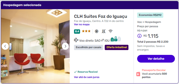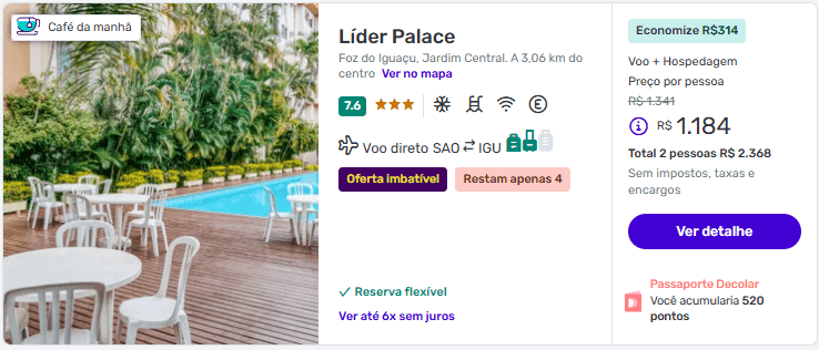 Além dos preços mais baixos, com os pacotes de voo + hospedagem, você acumula pontos no Passaporte Decolar para usar em futuras viagens. A reserva é flexível, permitindo cancelamento gratuito até 3 dias antes do check-in.