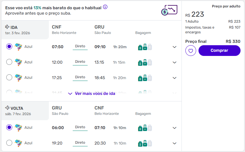 Belo Horizonte (CNF) – São Paulo (GRU) a partir de R$ 330 ida e volta, com taxas.