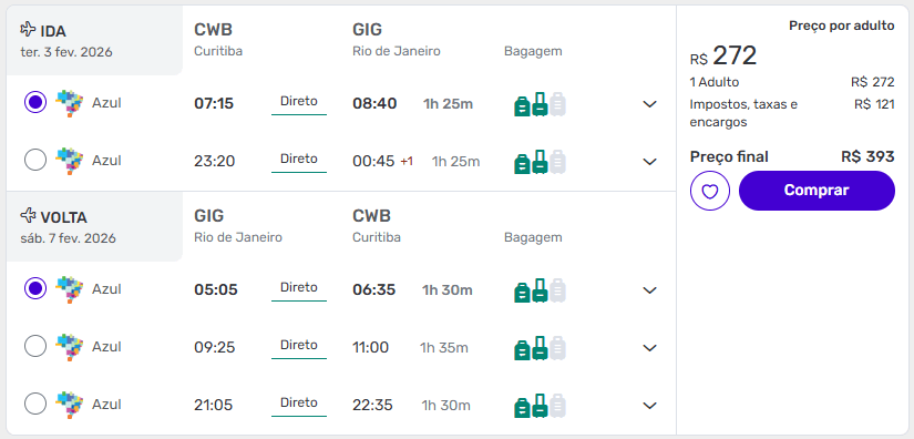 Curitiba (CWB) – Rio de Janeiro (GIG) a partir de R$ 393 ida e volta, com taxas.