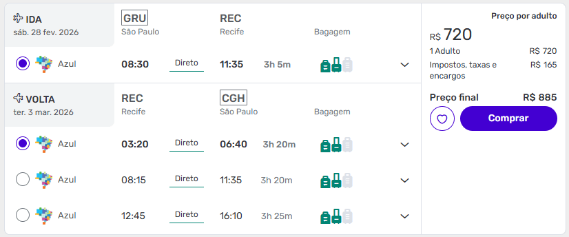 São Paulo (GRU) – Recife (REC) a partir de R$ 885 ida e volta, com taxas.