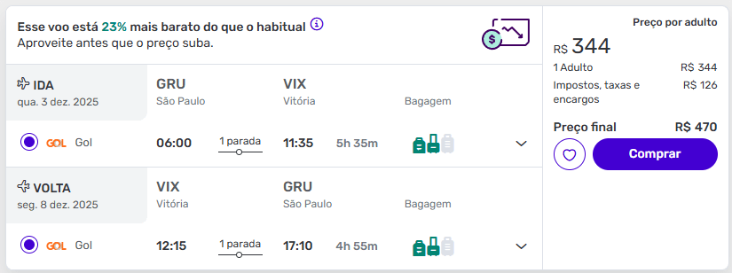 São Paulo (GRU) – Vitória (VIX) a partir de R$ 470 ida e volta, com taxas.