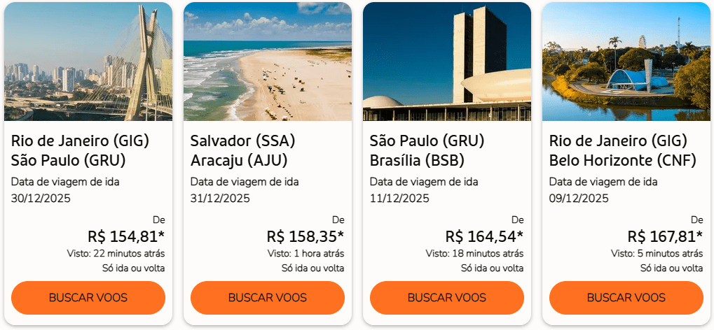 Além do site da GOL, vale a pena pesquisar também na Decolar — o site frequentemente oferece preços diferenciados e promoções próprias, como a “Pacotes Imbatíveis”, que reúne voos + hospedagem com descontos exclusivos.