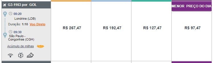 Na imagem, acima, podemos ver GOL passagens aéreas em promoção relâmpago saindo de Londrina (LDB) com destino a São Paulo (CGH) por APENAS R$ 97,47 o trecho com taxas, barato! E esse é só um exemplo.