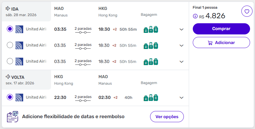 Manaus (MAO) → Hong Kong a partir de R$ 4.826 (ida e volta, taxas e bagagem inclusas)